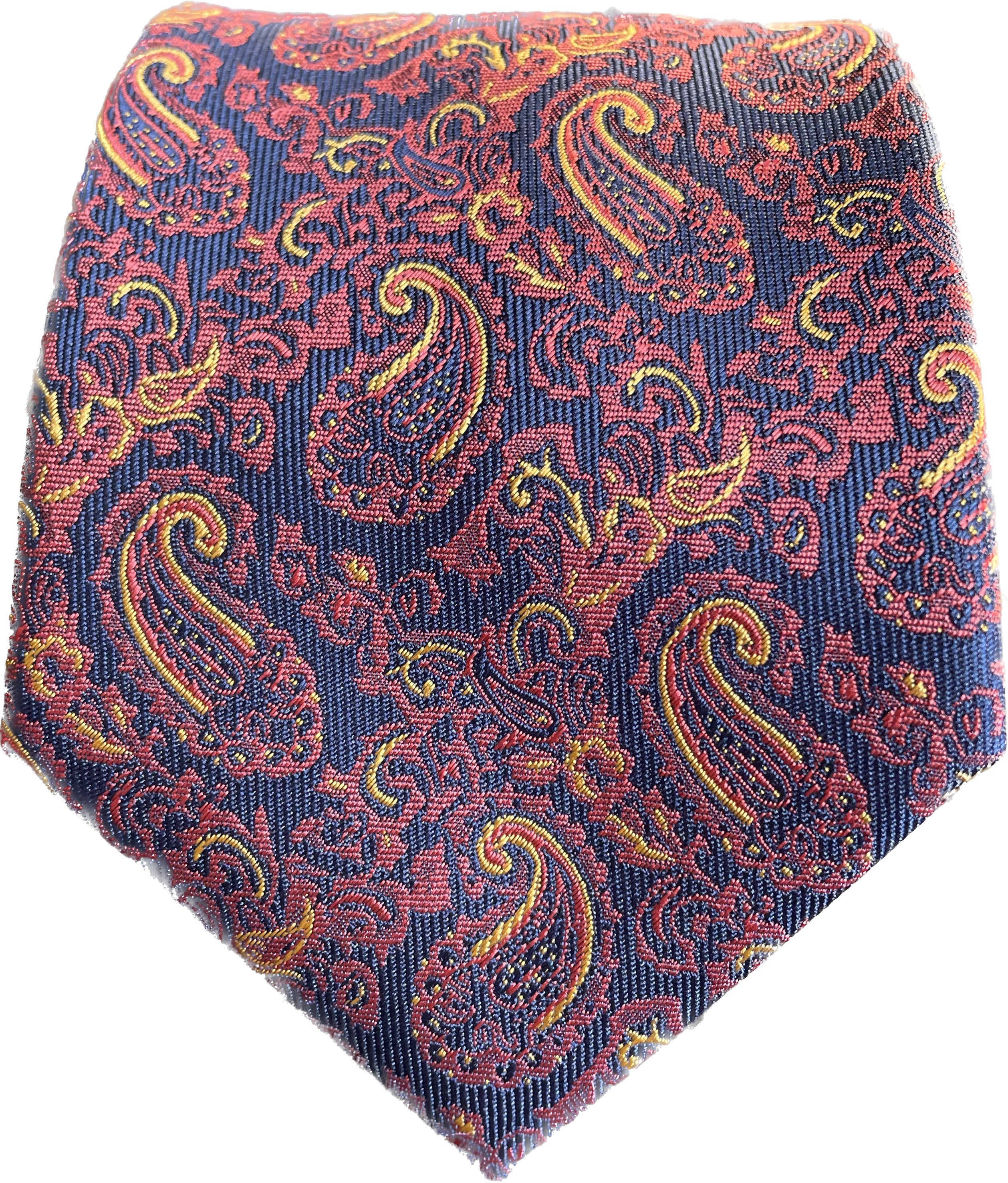 The ebullient autumnal colours of burnt orange and sumptuous crimson make for a vivacious colour palette. Paired with a classic paisley pattern, this silk tie is simply stunning. It is believed that the paisley pattern, or the teardrop-shaped boteh or buta, dates back to around 500 years ago in Persia. The stylized floral spray and cypress tree motif is believed to be the Zoroastrian symbol of life and eternity. Ornate paisley print adorned royalty and court magistrates, often in the form of coveted Kashmir shawls.